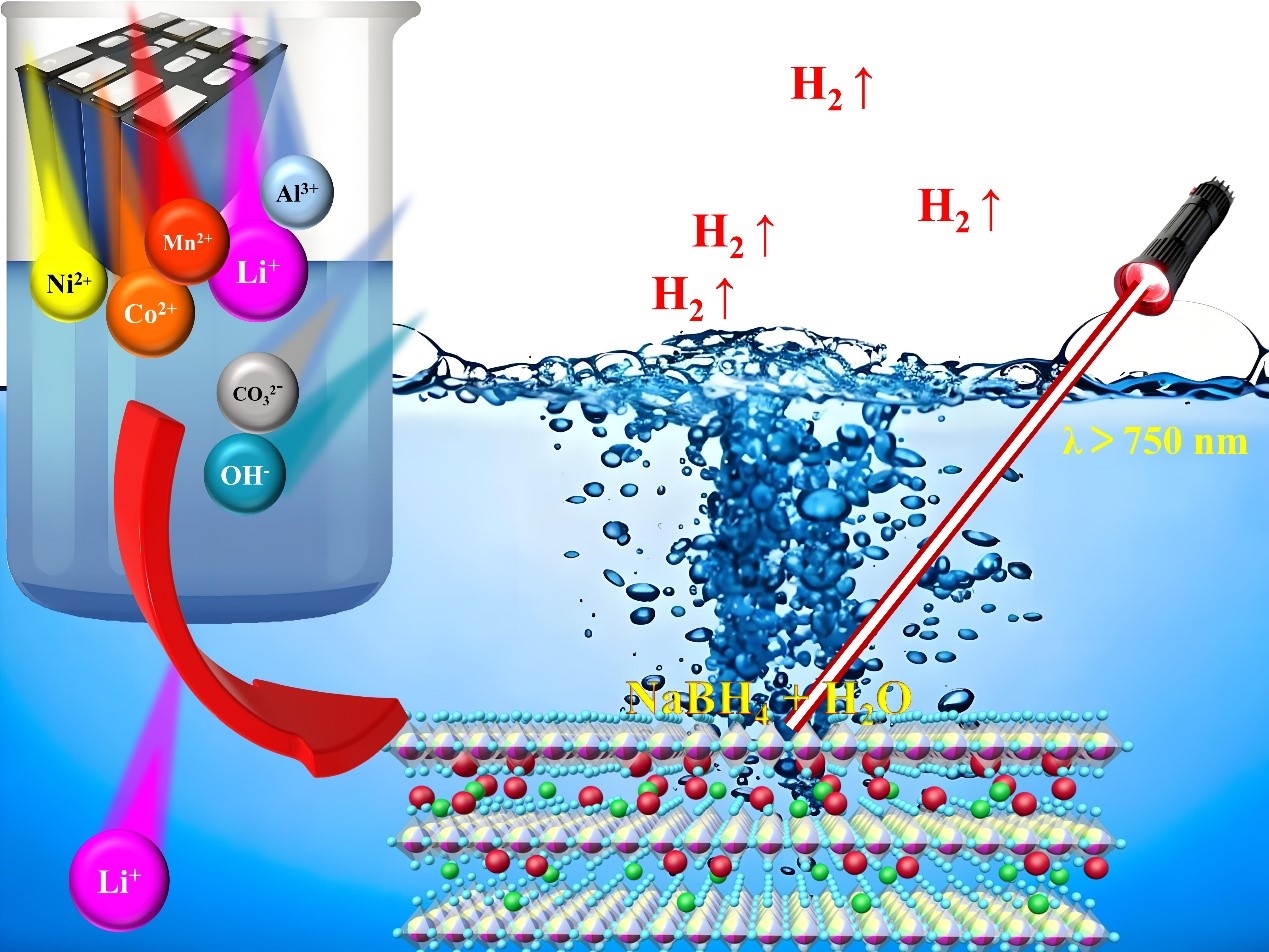 废弃锂电池中有毒金属离子的回收与绿色应用是世界性的环境问题。本研究基于层状双金属氢氧化物(LDHs)结构高容忍度的特性,利用锂电池制造过程产生的废酸(含有H+、Co2+、Mn2+、Fe3+和NO3-) 和废碱液(含有Li+、CO32-和OH-) 与废弃三元锂离子电池的正极材料(含有Li+、Ni2+、Co2+、Mn2+和Al3+)反应制备高熵NiCoMnAlFe-LDHs,实现有毒金属离子的高效回收。所制备的高熵NiCoMnAlFe-LDHs能够应用于可控催化NaBH4释氢。其中Co2+使催化剂在红外光波段表现强烈的光热转换性能,催化剂表面产生局域高温并迅速催化分解NaBH4溶液释放氢气,在波长为1050 nm的红外激光照射下其催化析氢速率可达1.72 mol · h-1 · g-1· W-1。该反应在脱离光照后可迅速停止,从而实现NaBH4的可控释氢,有效解决NaBH4作为氢能载体在释放氢气过程中的科学难题。本研究为实现废弃三元锂的循环利用和有害物的绿色化应用提供一个新的思路。